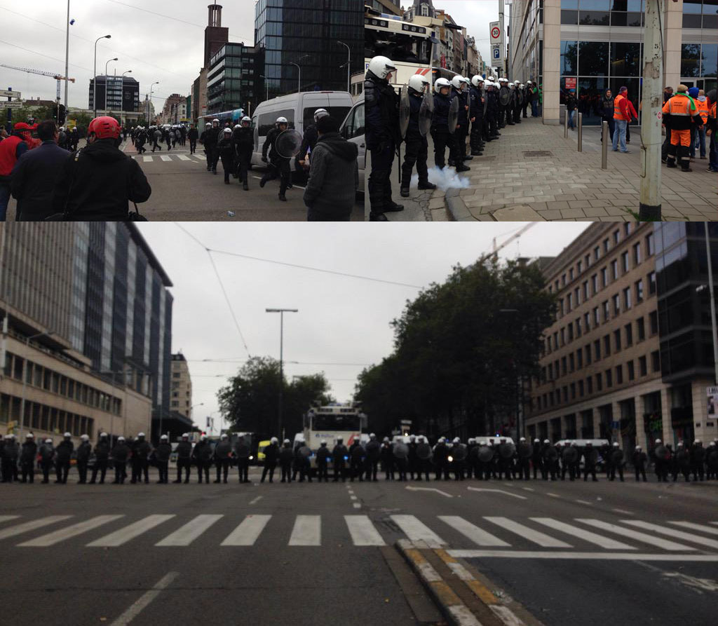 Dés l’arrivée de la manifestation à l’Esplanade de l’Europe, plusieurs centaines de manifestants (pour ne pas dire un petit millier…) ont tenté de forcer le passage, sans succès. Au fur et à mesure que les cadres syndicaux et que l’animation musicale s’en allaient, les cordons anti-émeute repoussaient les manifestants vers la Gare du Midi, en recevant bouteilles et pavés en représailles, ils y ont répondu par des tirs de grenades lacrymogènes.