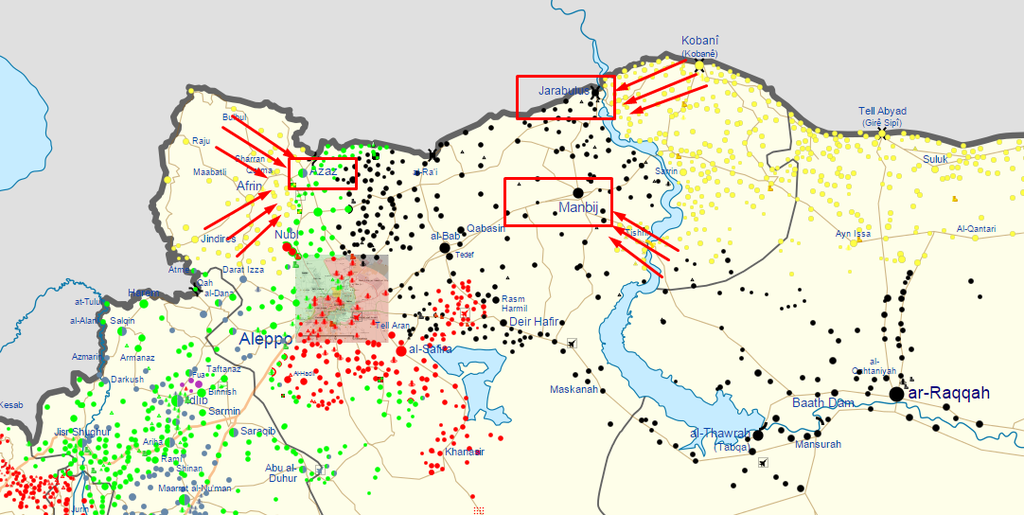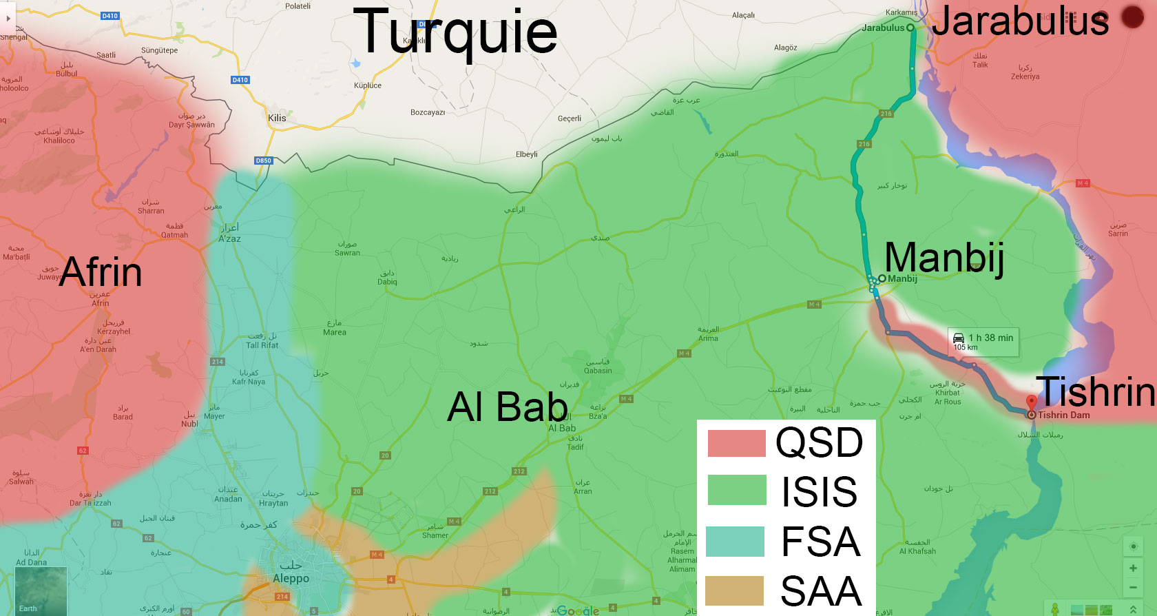 Sur le front d’Afrin, les QSD percent les lignes des factions islamistes de « l’Armée Syrienne Libre » (Front Islamique et Front al-Nusra). Leur objectif est de retrouver le front de Manbij à Jarabulus. Mais l’État turc préfère largement un état Islamique à un état kurde à de frontière. Ce jeudi, l’armée turque est donc rentrée à Jarabulus, sans rencontrer aucune résistance de l’occupant islamiste actuel. L’armée turque procède également à des tirs de mortiers contre les Forces Démocratiques à Manbij.