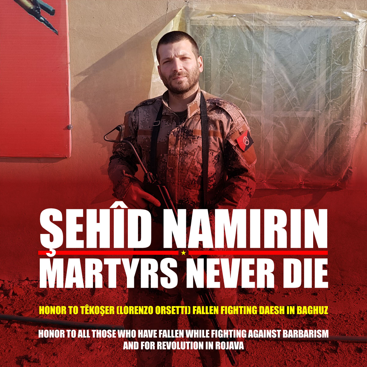 Tekoşer Piling (Lorenzo Orsetti), combattant anarchiste de 33 ans, originaire de Florence en Italie, est tombé en martyr ce matin en combattant l’État Islamique à Baghouz près de Deir Ezzor. Tekoşer était au Rojava depuis un an et demi, il avait participé à de très nombreuses opérations aux côtés de Tikko, dont la Bataille d’Afrin. Il était membre de Tekoşîna Anarşîst.