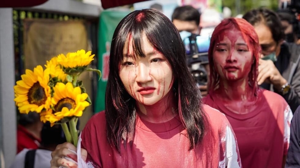 Badigeonnées de peinture rouge pour imiter le sang, Tantawan « Tawan » Tuatulanon et Orawan “Bam” Phuphong, deux jeunes militantes se sont présentées au tribunal pénal de Bangkok le 16 janvier 2023 pour demander à une juge d’annuler leur remise en liberté sous caution, en solidarité avec les autres militants incarcérés pour crime de “lèse-majesté” (photo). Elles avaient été inculpées en février 2022 pour le même motif, après avoir organisé un “sondage d’opinion” au sujet de la monarchie dans un centre commercial de Bangkok. Le 18 janvier, elles ont entamé une grève de la faim et de la soif. Elles ont été hospitalisées mais refusent tous soins médicaux. Depuis, un mouvement de solidarité se développe, des concerts, rassemblements, graffitis et messages de soutiens se sont multipliés cette semaine dans toute la Thaïlande et sur les réseaux sociaux.