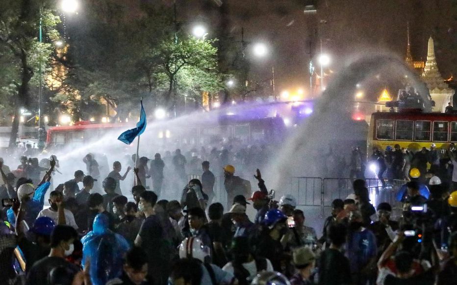 La police a utilisé un canon à eau contre les manifestants antigouvernementaux, pour les empêcher de se rendre au Bureau de la Maison Royale du Grand Palais à Bangkok, dimanche 8 novembre. Les affrontements ont eu lieu lorsque les manifestants ont atteint la zone située devant le bâtiment de la Cour suprême à Sanam Luang en route pour soumettre des lettres adressées au bureau demandant la réforme de la monarchie. Les manifestants se sont alors heurtés à une barricade de bus et de fils barbelés. Malgré les canons à eau, certains ont réussi à se rendre à proximité du Grand Palais.
