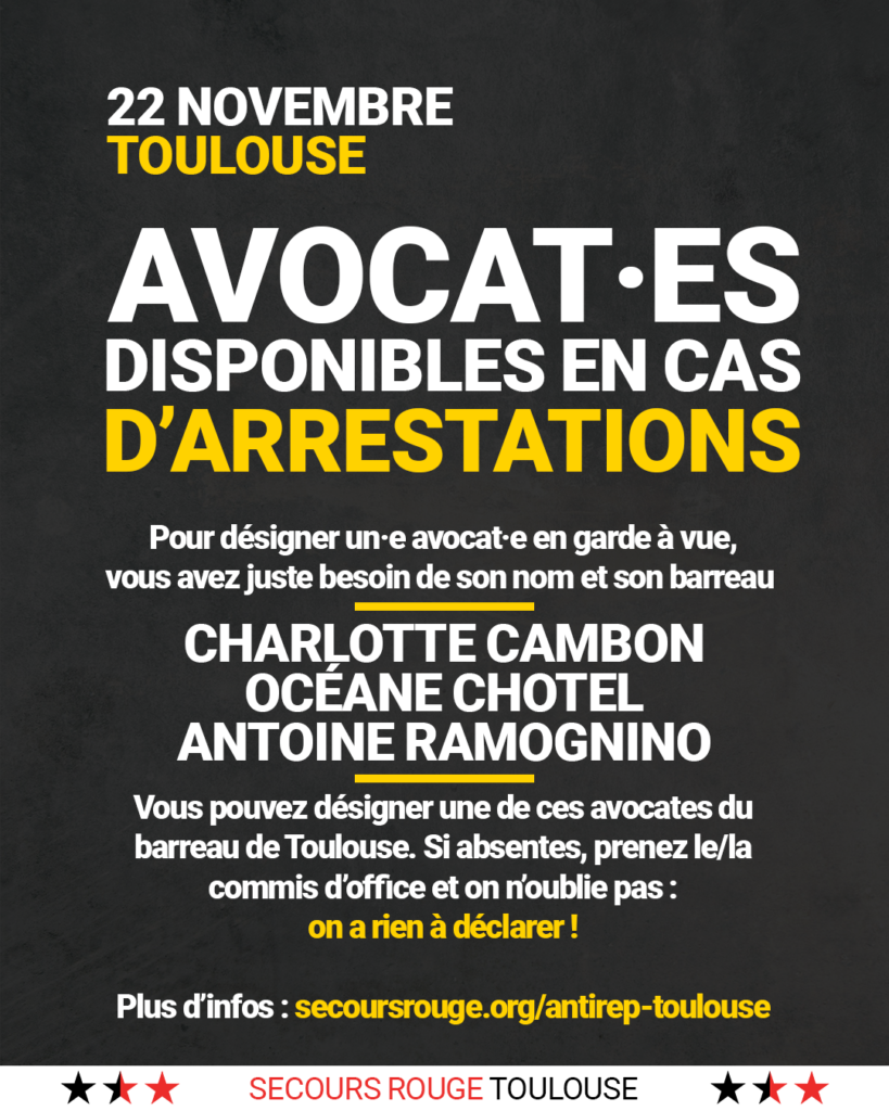 Pour le 22 novembre à Toulouse, voici les noms d’avocates disponibles en cas d’arrestations : Charlotte Cambon, Océane Chotel et Antoine Ramognino. Pour désigner un·e avocat·e en garde à vue, vous avez juste besoin de son nom et son barreau. Vous pouvez désigner un de ces avocat·es du barreau de Toulouse. Si absent·es, prenez le/la commis d’office et on n’oublie pas : on a rien à déclarer ! Voir aussi notre « Petit guide légal des manifestant·es ».