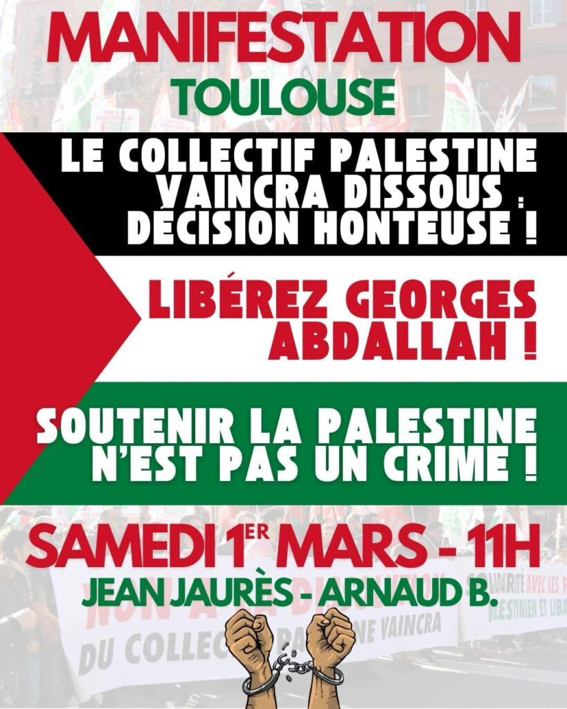 Suite à l’annonce de la dissolution du Collectif Palestine Vaincra (voir notre article) et la nouvelle manœuvre juridique pour prolonger la détention de Georges Abdallah (voir notre article), plusieurs organisations appellent à manifester ce samedi 1er mars à 11H au départ du métro Jean Jaurès à Toulouse.
