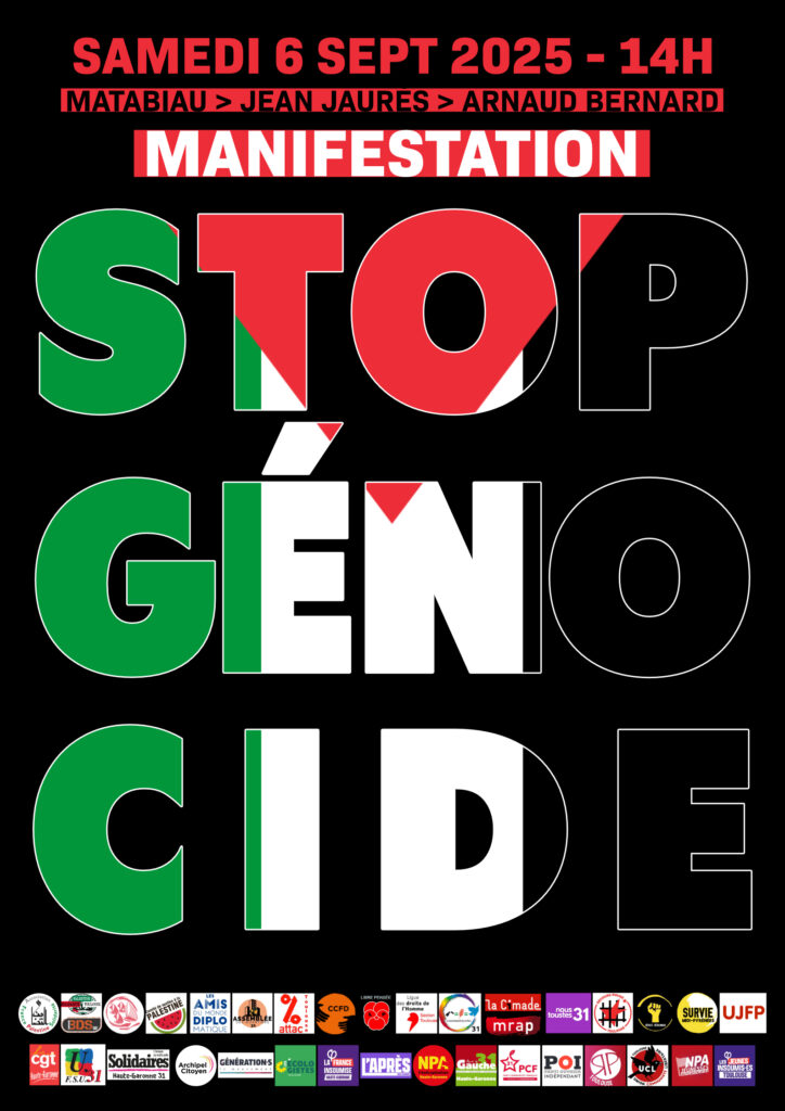 Au côté d’une vingtaine d’organisations, le Secours Rouge Toulouse appelle à manifester ce samedi 6 septembre dès 14H au départ de la gare Matabiau contre le génocide en cours à Gaza, mais également pour dénoncer la complicité de l’impérialisme français et exiger la libération de l’ensemble des personnes engagées en faveur de la Palestine.