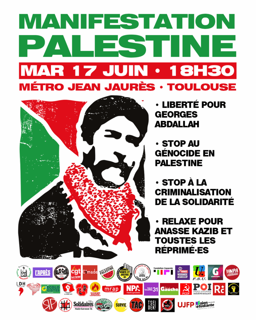 À l’appel de plus d’une trentaine d’organisations, une manifestation contre le génocide en cours en Palestine, mais aussi en soutien à Georges Abdallah et la criminalisation de la solidarité, est organisée ce mardi 17 juin dès 18H30 au départ du métro Jean Jaurès à Toulouse. Celle-ci est organisée alors qu’une audience décisive pour la libération du communiste libanais se tiendra à la Cour d’Appel de Paris le 19 juin prochain (voir l’appel unitaire).