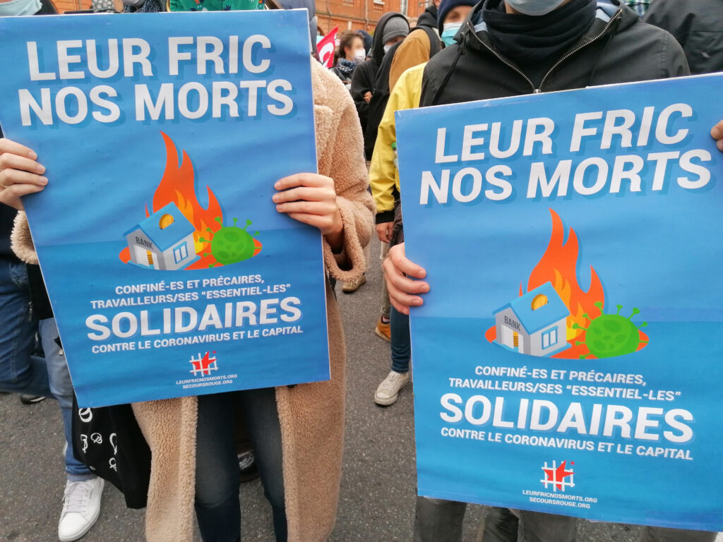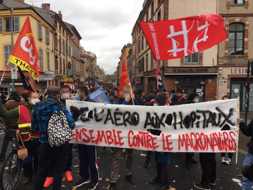 Dans la manifestation, de nombreux secteurs étaient présents. Un pôle rouge et noir a été formé ainsi qu’un cortège de salarié·e·s de l’aéronautique avec une banderole « De l’aéro aux hôpitaux, ensemble contre le macronavirus ». Deux initiatives auxquelles des membres du Secours Rouge Toulouse ont participé.