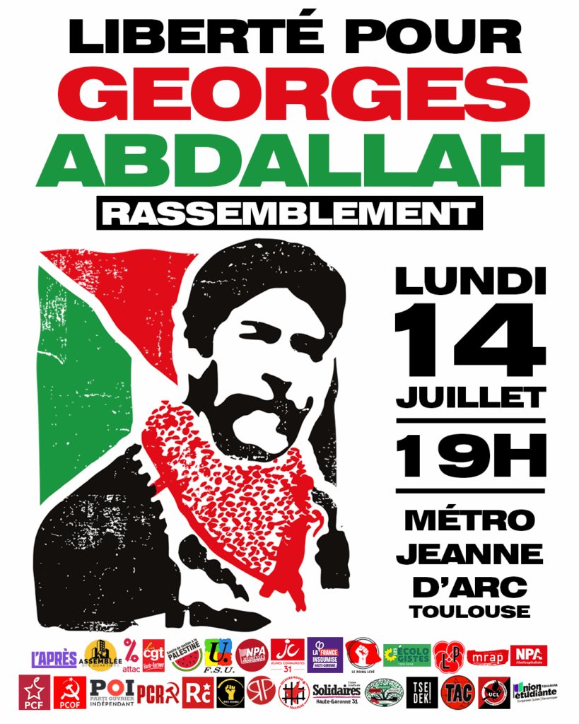 Plusieurs dizaines d’organisations toulousaines appellent à se rassembler ce lundi 14 juillet à 19H à la sortie du métro Jeanne d’Arc à Toulouse en soutien à Georges Abdallah (lire l’appel). Communiste libanais et combattant de la résistance palestinienne, il est emprisonné en France depuis plus de 40 ans alors qu’il est libérable depuis 1999. Devenu le plus ancien prisonnier politique d’Europe, il est la cible d’un acharnement politico-judiciaire alors même qu’il refuse de céder au chantage au reniement et demeure fidèle à son engagement révolutionnaire.