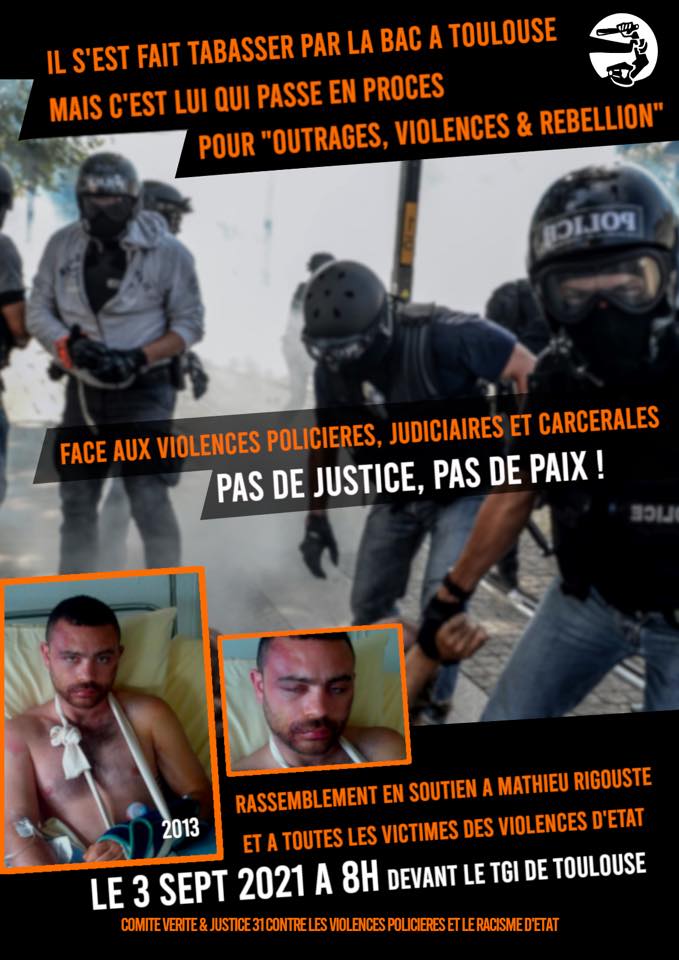 Vendredi 3 septembre, le Comité Vérité et Justice 31 appelle à un rassemblement de soutien à Mathieu Rigouste dès 8H devant le Tribunal de Grande Instance de Toulouse. Chercheur en sciences sociales et militant contre les violences d’État, il passe en procès pour « outrages, violences et rébellion » alors qu’il a été victime d’un tabassage par la police en juin 2013.