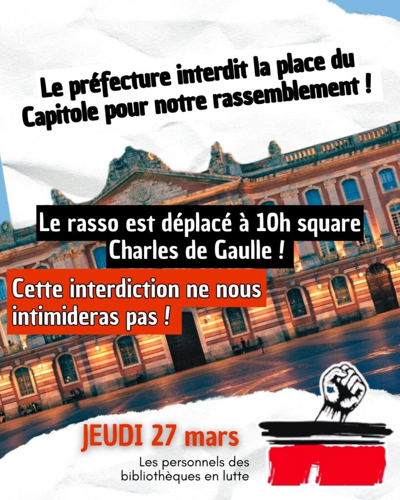 Jeudi 27 mars, des travailleurs de plusieurs secteurs et services publics seront en grève à Toulouse pour dénoncer la politique d’austérité de la municipalité et défendre l’emploi. Dans ce cadre, près de 60 organisations (dont le Secours Rouge Toulouse) appellent à se rassembler ce jeudi 27 mars à 10 heures au Square Charles de Gaulle. Initialement prévu sur la place du Capitole, celui-ci a été interdit et déplacé à la dernière minute. Une nouvelle intimidation qui n’entamera pas la détermination des agents en grève et leurs soutiens.
