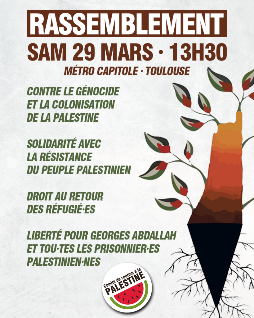 A l’occasion des commémorations de la Journée de la Terre palestinienne, le Comité de soutien à la Palestine et plusieurs organisations toulousaines appellent à se rassembler ce samedi 29 mars à 13H30 au métro Capitole à Toulouse. L’occasion d’exiger également la libération de Georges Abdallah et de tous les prisonniers palestiniens.