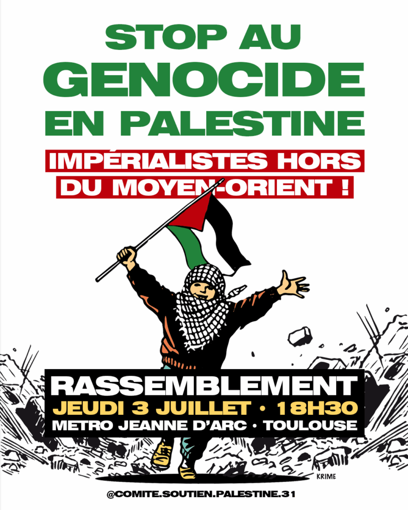 À l’appel du Comité de soutien à la Palestine, un rassemblement est organisé ce jeudi 3 juillet à 18H30 au métro Jeanne d’Arc pour dénoncer le génocide en cours en Palestine et les interventions impérialistes dans la région (voir ici). En plus de dénoncer la complicité de la France avec l’opération génocidaire qui se poursuit depuis 20 mois, l’appel dénonce les offensives militaires, mais aussi les dispositifs de sanctions économiques, menées de concert par l’impérialisme occidental et l’État sioniste contre les peuples du Monde arabe et d’Iran.