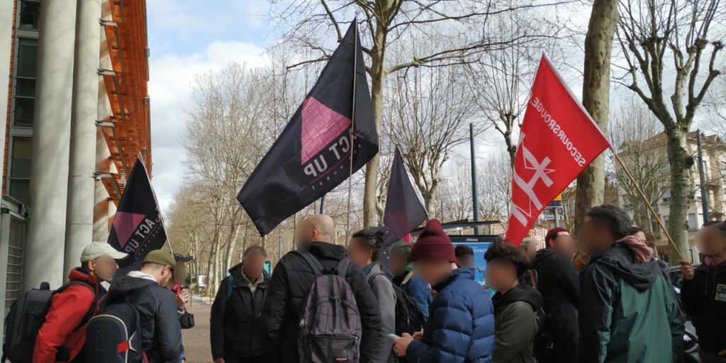 Mercredi 12 février, plusieurs dizaines de personnes se sont rassemblées devant le Tribunal de Grande Instance de Toulouse en soutien à Louise Lourdou, ancienne présidente de l’association de lutte contre le VIH/SIDA Act Up Sud-Ouest. Condamnée en première instance pour « injures publiques » suite à une plainte de La Manif pour Tous, elle passait aujourd’hui en appel. L’action incriminée est un déploiement de banderoles et un collage d’affiches devant une salle qui accueillait La Manif pour Tous et où on pouvait lire « La Manif pour Tous est homophobe » ou encore « La Manif pour Tous complice du SIDA ». Finalement, le procès a été reporté au mois d’avril.