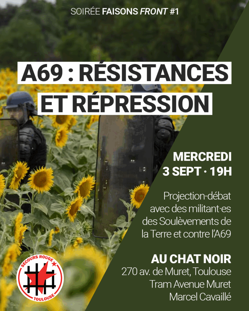 Déluges de grenades, flics infiltrés, personne emprisonnée, coups de force juridiques, campagnes médiatiques, etc. L’État, ses flics et ses relais sortent les grands moyens pour tenter d’imposer leur projet écocidaire entre Castres et Toulouse. Face à eux, une résistance durable, multiforme et plurielle. Alors que la lutte contre l’A69 continue plus que jamais, comment développer nos solidarités pour construire une société débarrassée de leur monde ? Mercredi 3 septembre à 19H au Chat Noir, le Secours Rouge Toulouse propose sa première soirée mensuelle Faisons Front sur le thème « A69 — résistances et répression » avec des militant·es des Soulèvements de la Terre et contre l’A69.