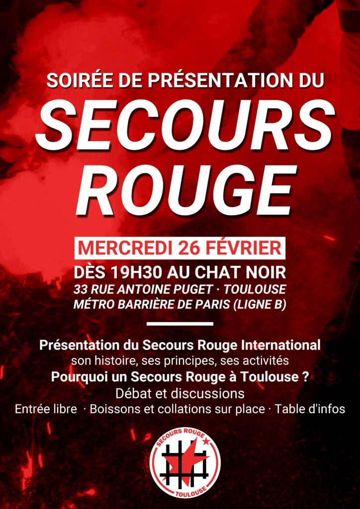 Le Secours Rouge Toulouse organise une soirée de présentation au local révolutionnaire le Chat Noir le mercredi 26 février prochain dès 19H30. Cela sera l’occasion de présenter le Secours Rouge International, ses principes et ses activités, mais aussi les raisons de la fondation de cette nouvelle structure à Toulouse.