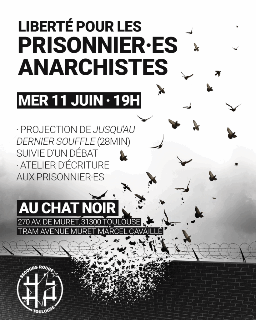 A l’occasion du 11 juin – Journée internationale de solidarité avec Marius Mason et toustes les prisonnier·es anarchistes de longue durée, le Secours Rouge Toulouse organise une soirée de solidarité le mercredi 11 juin à 19H au Chat Noir (270 avenue de Muret). Après la projection de “Jusqu’au dernier souffle” sur la grève de la faim de 180 jours d’Alfredo Cospito contre ses conditions de détention en Italie, nous proposons une discussion sur les mobilisations à construire aujourd’hui ainsi qu’un atelier d’écriture aux prisonnier·es. L’ensemble des bénéfices de la soirée seront reversés à un fond de solidarité avec des militant·es anarchistes réprimé·es.