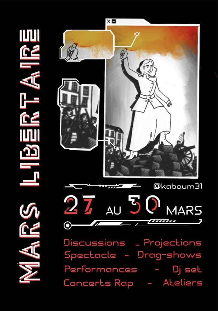 Du 27 au 30 mars à Toulouse, Kaboum organise le Mars Libertaire avec de nombreuses discussions, projections, rencontres et spectacles. « Dans un contexte politique fascinant, où l’état réprime toujours d’avantage les mouvements et luttes libertaires, nous avons besoin de ces espaces si nous voulons construire et renforcer la lutte contre tous les systèmes de domination » soulignent les organisateurs.