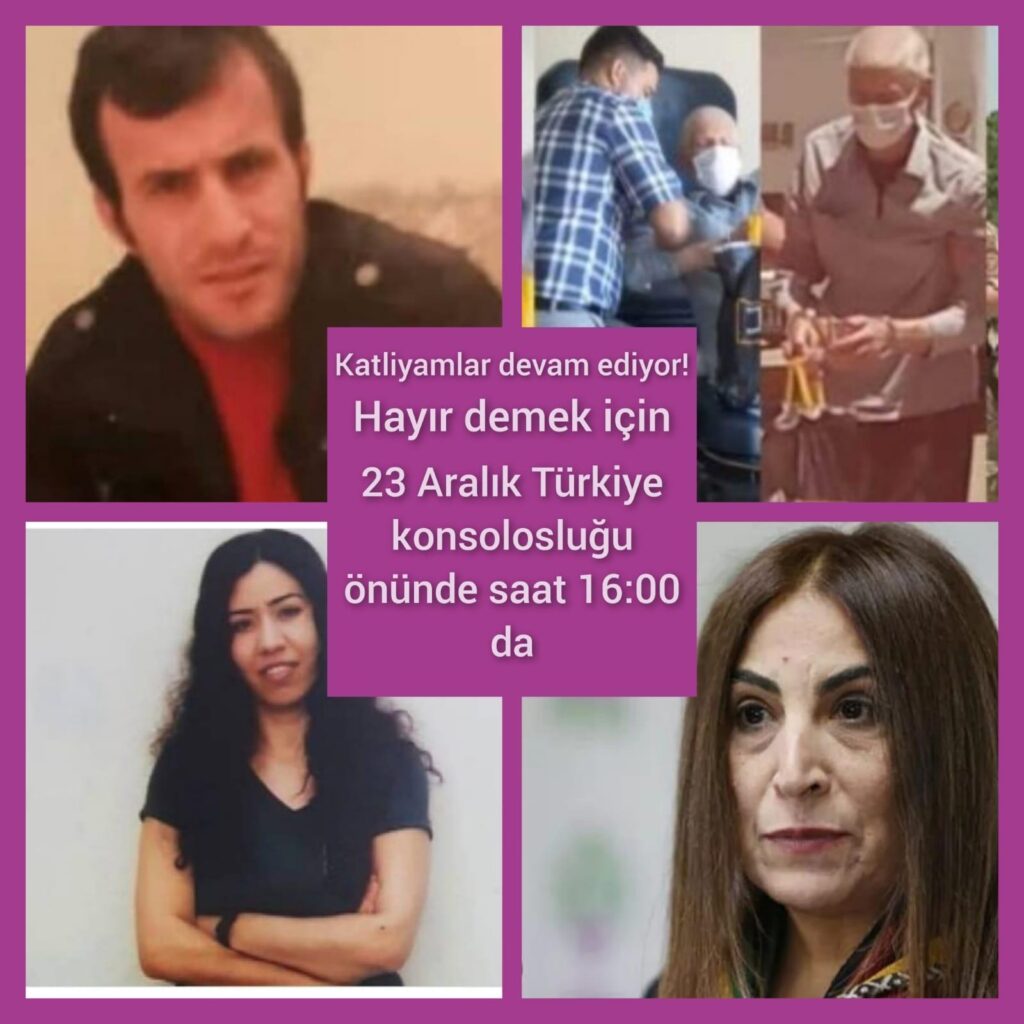 Le décès d’Erkmen est le cinquième décès de prisonnier politique dans les prisons turques en moins de 10 jours. Outre Garibe Gezer, Abdulrezzak Suyur est mort le 14 décembre dans la prison de Sakran, suivi le lendemain par Halil Güneş, décédé dans la prison de haute sécurité n°2 de Diyarbakır, puis par Ilyas Demir, décédé dans la prison de type T de Bolu le 18 décembre. Halil Günes un prisonniers politique kurde qui figurait sur la liste des prisonniers gravement malades établie par l’Association des droits de l’homme (IHD), et maintenu en prison malgré des demandes répétées de libération et son état de santé. Le SKB appelle à un rassemblement devant le consulat de Turquie de Bruxelles demain 23 décembre à 16h00.