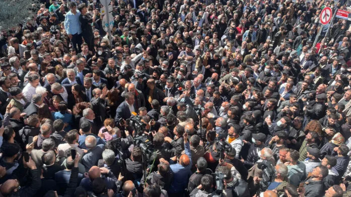 Après avoir déclaré inéligible le co-maire kurde du u Parti de la Démocratie et de l’Égalité des Peuples (DEM), nouvellement élu dans la métropole de Van avec une majorité absolue des voix, le Conseil électoral régional de Van a attribué aujourd’hui le mandat municipal au candidat de l’AKP arrivé en seconde position. À l’appel du DEM, des dizaines de milliers de personnes ont défilé dans les rues de Van pour protester contre cette confiscation de la victoire électroale du DEM. Défiant la forte présence policière, les manifestants ont marché jusqu’au parc Feqiyê Teyran puis se sont mis en marche vers le palais de justice où se trouve le bureau de la commission électorale. Le cortège a été attaqué par la police avec des bombes de gaz et des canons à eau.
