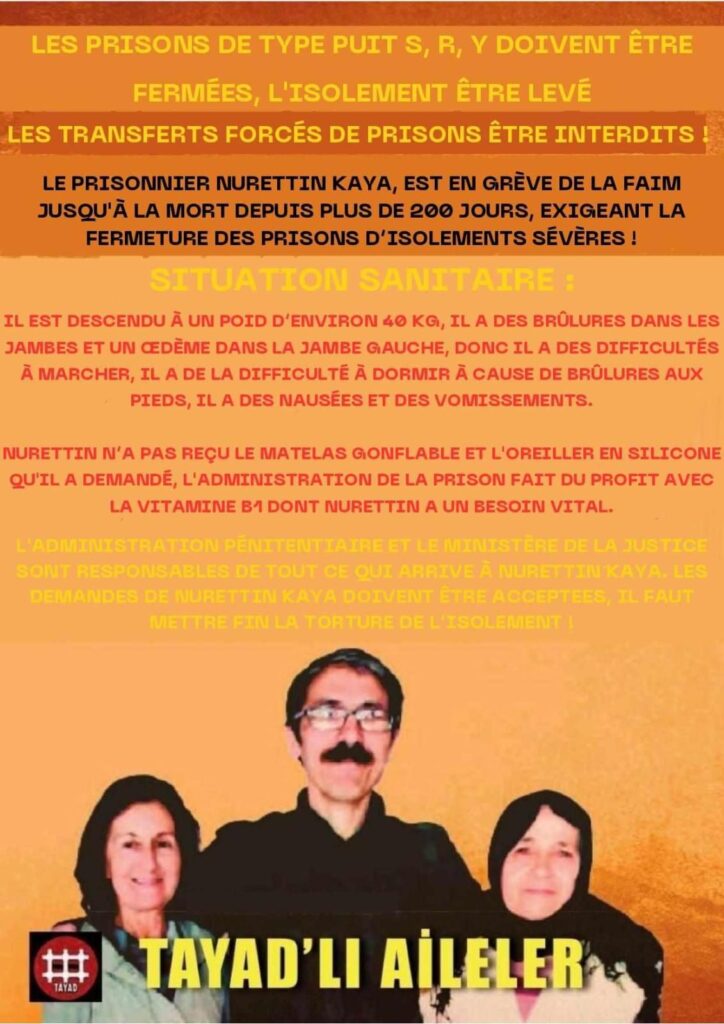 Le prisonnier politique Nurretin Kaya est en grève de la faim depuis plus de 200 jours. Il pèse actuellement 40 kg. Cette lutte extrême (jeûne de la mort) menée par le camarade turc s’oppose à la politique de torture de l’isolement. En Turquie, il existe des prisons avec des cellules spéciales (S,R,Y) où vous n’avez aucun contact avec d’autres êtres humains, pas même avec les gardiens, qui vous parlent à travers un microphone. Vous n’avez jamais la lumière du jour et vous n’entendez aucun son. C’est la situation que vivent quotidiennement les prisonniers de la gauche révolutionnaire turque et kurde.