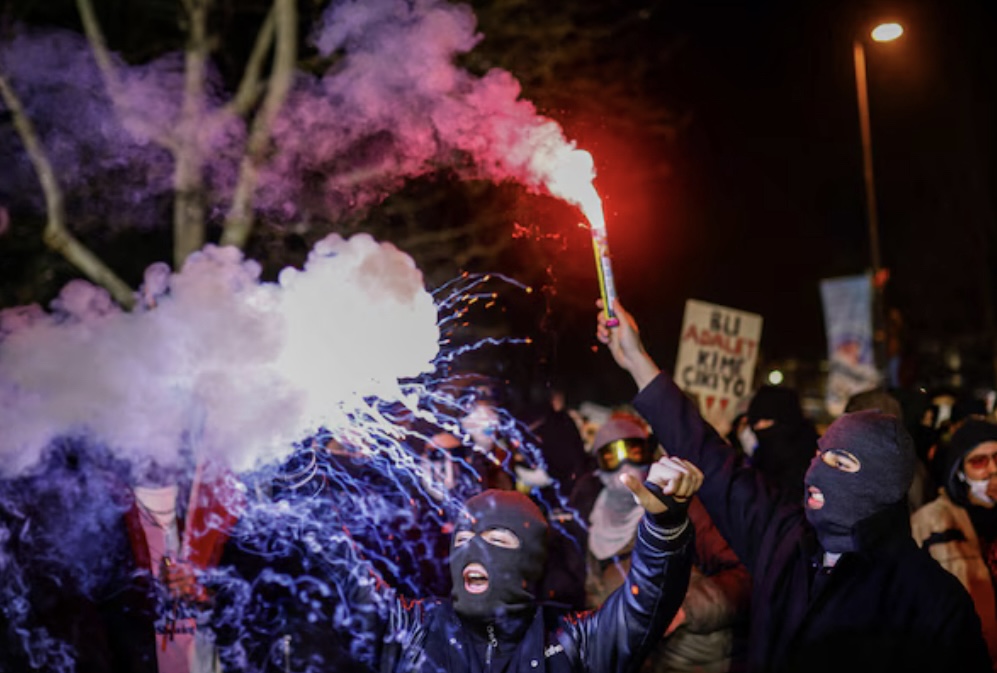 Le maire d’Istanbul et rival d’Erdogan, Ekrem İmamoglu, a été officiellement arrêté et mis en détention provisoire ce matin pour « corruption » et sera détenu à la prison de Silivri. Des millions de personnes sont descendues dans les rues de Turquie, des affrontements ont eu lieu à Saraçhane, à Istanbul et marquent la cinquième nuit de manifestations antigouvernementales massives. Le quartier de Saraçhane est devenu un haut lieu de protestation, situé à quelques kilomètres de la place Taksim que les manifestants tentent toujours d’atteindre, mais ils restent bloqués par d’importants barrages policiers maintenus 24 heures sur 24. Les forces de l’ordre ont violemment réprimé les contestataires, les frappant à coups de matraque et coups de pied, tout en essayant d’empêcher les personnes de filmer, ils ont fait abondamment usage de gaz lacrymogènes. Tout au long de la nuit, des appels invitant la police à joindre les rangs des manifestants anti-Erdogan ont été scandé : «Policier, révolte-toi aussi !» Les forces de l’ordre ont procédé à plusieurs centaines d’arrestations dans au moins neuf villes du pays, les autorités ont demandé au réseau social X la fermeture de plus de 700 comptes d’opposants, la plateforme s’est opposée à cette demande.
