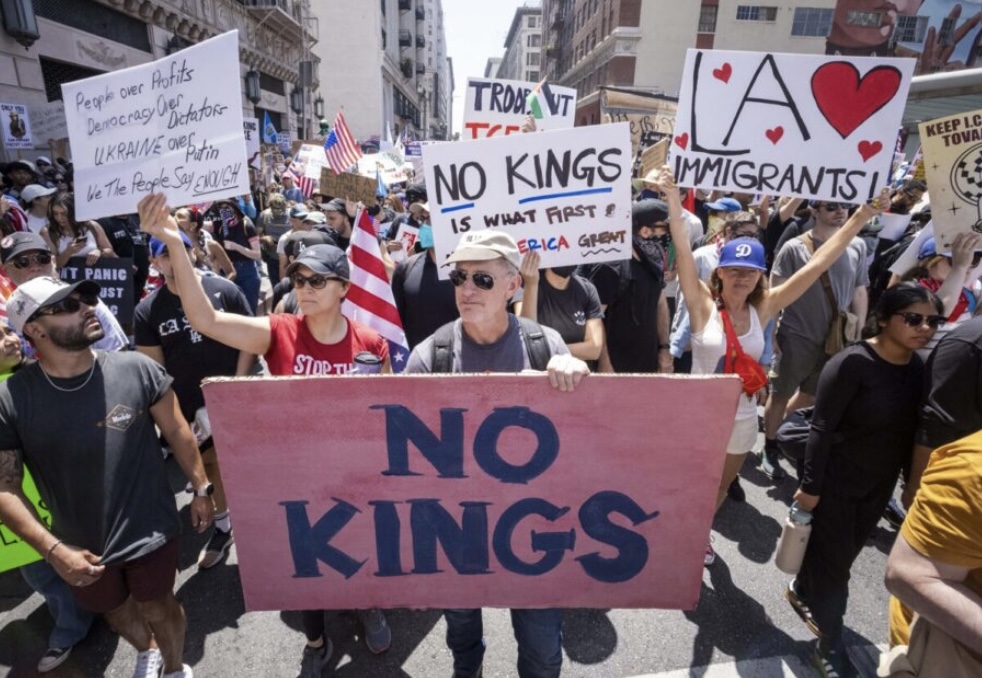 Los Angeles, une manifestation se tenait dans le cadre de la journée nationale de contestation « No Kings » ce samedi 14 juin. Pendant plusieurs heures, des milliers de personnes ont affiché dans le calme et en musique leur défiance envers Donald Trump, avant que la police n’intervienne pour disperser les manifestants. La journée avait commencé par des danses amérindiennes devant la mairie, des manifestants jouaient des percussions sur les barrières de sécurité, et des vendeurs ambulants répandaient dans l’air une odeur d’oignons frits. Sous un ballon géant représentant le président américain en bébé portant une couche, les manifestants ont défilé dans le centre-ville. De nombreuses pancartes comportaient le nom de Trump suivi de divers jurons étaient brandies, d’autres montraient des caricatures du président sous les traits du dirigeant nord-coréen Kim Jong Un.