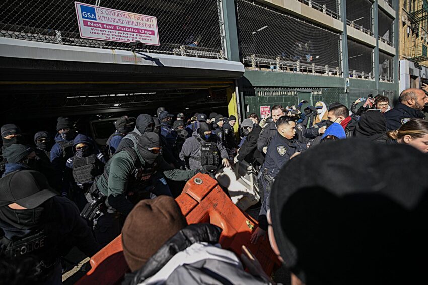 Quand l’ICE a ouvert la porte du garage pour évaluer la situation, la foule a commencé à scander « ICE hors de New York ». Des barricades légères ont commencé à apparaître derrière les premiers rangs de la foule. Les policiers de la ville (NYPD) ont commencé à s’interposer entre les agents de l’ICE et la foule qui accumulait du matériel de blocage (poubelles, palettes, etc.). Les agents de l’ICE sont restés piégés à l’intérieur du garage de 10h jusqu’en début d’après-midi. Pendant ce temps, le NYPD a fait plusieurs interpellations et disposé des grillages antiémeutes. Quand les voitures ont enfin commencé à sortir du garage, plusieurs personnes courageuses ont courru pour sauter devant le convoi. Cela l’a ralenti suffisamment pour que d’autres personnes puissent placer des objets en travers de la route. Le convoi, protégé par les policiers anti-émeutes du NYPD, a pu difficilement se dégager en raison des obstacles et des jets de projectiles. Finalement, une moitié du convoi est retournée au garage et l’autre moitié a quitté New-York, se dirigeant vers Jersey City. Après la fin de l’action, des groupes communautaires ont continué à surveiller le quartier de Canal Street, au cas où l’ICE auraient essayé de revenir, et des groupes anti-ICE ont patrouillé le reste de la journée et le lendemain. Le NYPD a fait une dizaine d’arrestations, tout au long de la journée, et a accusé deux de ces personnes de violences contre des policiers. Plus de détails ici