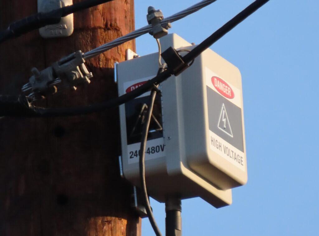 Un système de caméra de surveillance cachée a été repéré sur un poteau téléphonique à Portland. La caméra est dissimulée à l’intérieur d’un boîtier fixé au sommet d’un poteau téléphonique. Le boîtier est conçu pour ressembler à une sorte d’équipement électrique. Sur le devant du boîtier, il y a une inscription indiquant « Danger » et « Haute tension ». Le bas du boîtier a un câble qui sort et qui semble être relié à la ligne électrique. Au centre du boîtier et sur les côtés, il y a un carré noir rectangulaire. D’après d’appareils similaires, il s’agit probablement d’une fenêtre unidirectionnelle, pour que la caméra puisse voir dehors. Il n’est pas clair quelle agence de police a installé la caméra, mais elle pointe directement sur la maison d’une agente de l’ICE, dont des informations personnelles ont été rendues publiques il y a quelques mois (voir notre article).