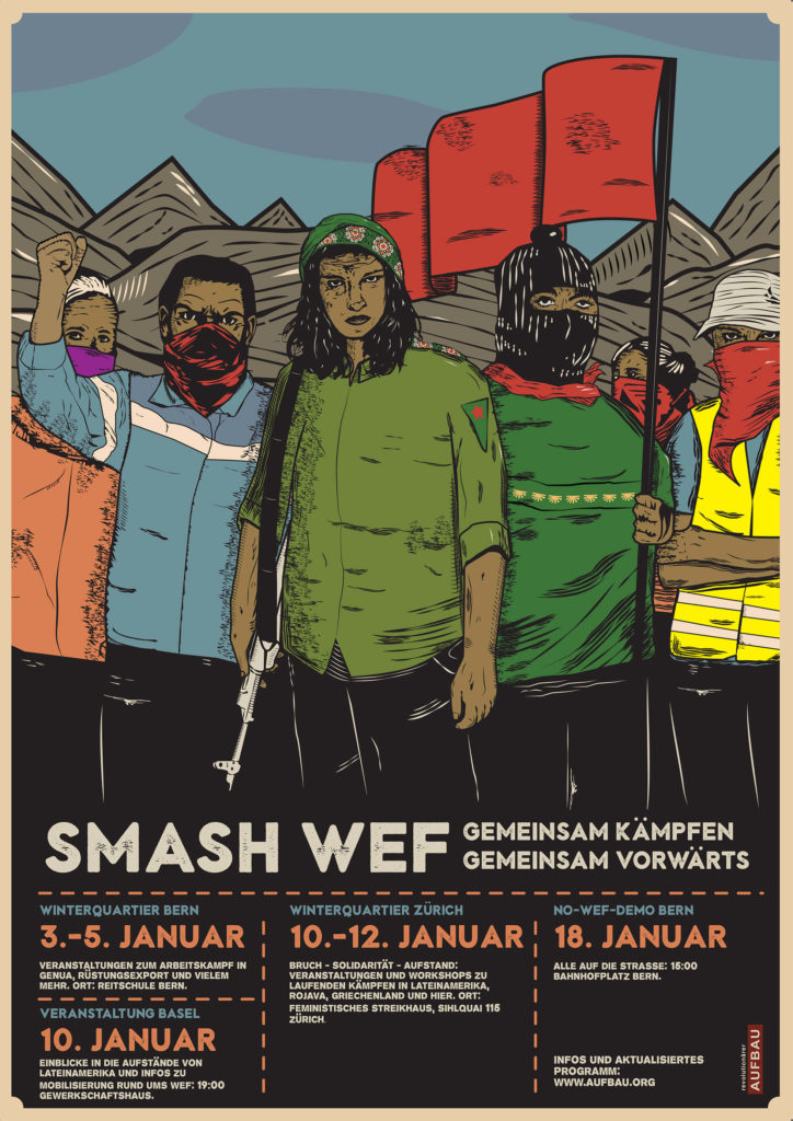 A l’occasion de la mobilisation contre le 50ème Forum économique mondial (WEF) à Davos organisée par une coalition d’organisations révolutionnaires, Revolutionäre Aufbau organise un weekend de mobilisation à Zurich du 10 au 12 janvier 2020. Il sera notamment question de la solidarité avec le Rojava, de la résistance anti-OTAN en Sardaigne, du féminisme, des mobilisations populaires en Amérique Latine etc. Le dimanche 12 janvier après-midi, le Secours Rouge Toulouse interviendra lors d’une conférence « Gilets Jaunes et grève générale : combattre la bourgeoisie ! »